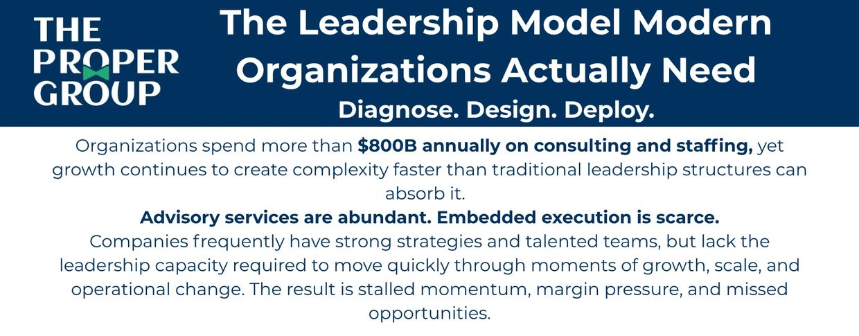 We believe the future belongs to organizations that combine embedded leadership, scalable IP, and platform thinking. The Proper Group delivers CLaaS—Collective Leadership-as-a-Service—so you don't just add people, you add momentum.